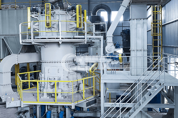 立式磨粉機的粉磨工藝是由一套碾磨裝置(即磨輥和磨盤)來完成的,物料在磨輥和磨盤之間被碾磨成粉狀。碾磨裝置的運動由磨盤回轉并相應帶動磨輥傳動,碾磨壓力除了磨輥自重外,主要靠一套液壓裝置對磨盤物料加壓。經碾磨后的物料中存在大量粗粉,經配套的選粉機選粉,粉體的選粉過程是經過氣流分選,在氣流流動過程中大部分粗粉自動落到磨盤上,接收再次粉磨,其余經選粉機選出為成品,經收塵及輸送系統送入成品儲庫。
